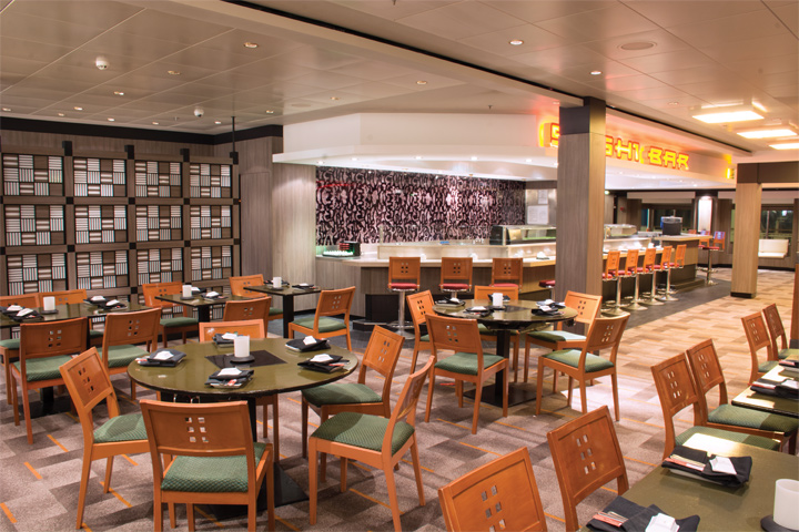 Azura: Balancing classic favorites with the hottest new dishes, Azura is a can't-miss culinary experience. With daily changing menus offering even more variety and Chef's Signature Dishes featuring deliciously fresh ingredients, there's always something to look forward to inside this Main Dining Room.