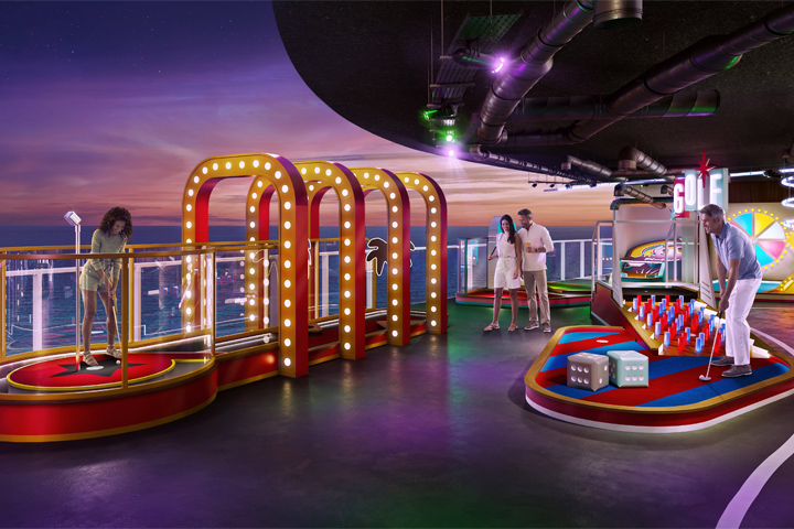 On board, you'll find 16 dining options and 13 exciting bars and lounges where you can just hang out. There's even a bowling alley (a cruise industry first!) and rock climbing wall.