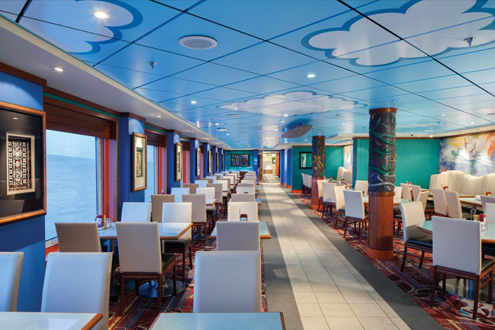 Aloha Café: This indoor/outdoor buffet-style eatery features food stations where you can order omelets, waffles, fruit, soups, ethnic specialties and pasta. Set against a Hawaiian theme with outrigger canoes, Polynesian carvings and even a kid-sized buffet.
