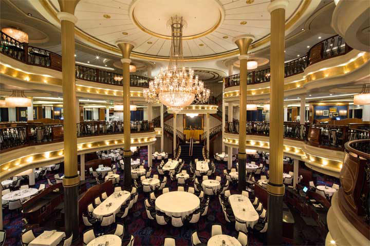 Main Dining Room: Sweeping, multi-level ambience, world-class cuisine and extraordinary personal service from a dedicated wait staff. Royal Caribbean's main dining room serves exceptional, multi-course meals for breakfast, lunch and dinner.