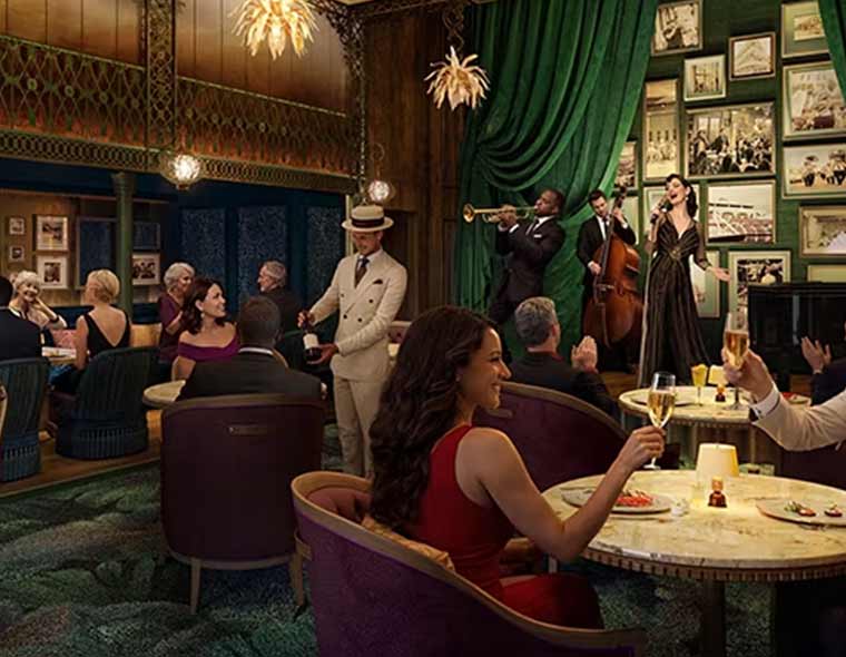 Main Dining Room: Offering a world-class culinary journey, with a rotating menu that invites you to taste flavors from around the globe—from Jamaica to Jaipur. This multi-level restaurant transforms throughout the day: a bright morning destination for a hearty brunch and refreshing mimosas, and in the evening, a sophisticated dining experience where every course is an unexpected delight.